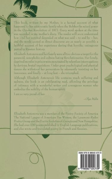 This book, written by my Mother, is a factual account of what happened to her aristocratic family when the Bolsheviks seized power in the October Revolution of 1.917. Every word spoken at the time was recorded in my mothers diary. The reader will soon understand how vital her survival depended on what was said - to and by - her, and the words quoted as direct discourse are as nearly as possible a faithful account of her experience during that horrific, outrageous period in Russian history. Elizabeth Antonova and her family were all too obvious a target. for the paranoid, xenophobic, and culture hating Revolutionaries. Her lonely, deprived months in prison were punctuated by relentless interrogations by devious, brutal inquisitors. tinder great psychological and physical duress she withstood her persecutors by adamantly insisting on her innocence, and finally - at long last - she triumphed. Although Elizabeth Antonova's tile contains much suffering and sadness, the book is an exhilarating read, affording the privilege of intimacy with a wonderful writer and courageous woman who embodies the nobility of the human spirit. I am so very proud of her.