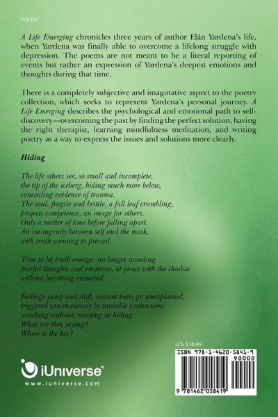 A Life Emerging chronicles three years of author Elán Yardena's life, when Yardena was finally able to overcome a lifelong struggle with depression. The poems are not meant to be a literal reporting of events but rather an expression of Yardena's deepest emotions and thoughts during that time. There is a completely subjective and imaginative aspect to the poetry collection, which seeks to represent Yardena's personal journey. A Life Emerging describes the psychological and emotional path to self-discovery-overcoming the past by finding the perfect solution, having the right therapist, learning mindfulness meditation, and writing poetry as a way to express the issues and solutions more clearly. Hiding The life others see, so small and incomplete, the tip of the iceberg, hiding much more below, concealing evidence of trauma. The soul, fragile and brittle, a fall leaf crumbling, projects competence, an image for others. Only a matter of time before falling apart. An incongruity between self and the mask, with truth wanting to prevail. Time to let truth emerge, no longer avoiding fearful thoughts and emotions, at peace with the shadow without becoming ensnared. Feelings jump and shift, instant tears go unexplained, triggered unconsciously by invisible connections watching without, reacting or hiding. What are they saying? Where is the key?