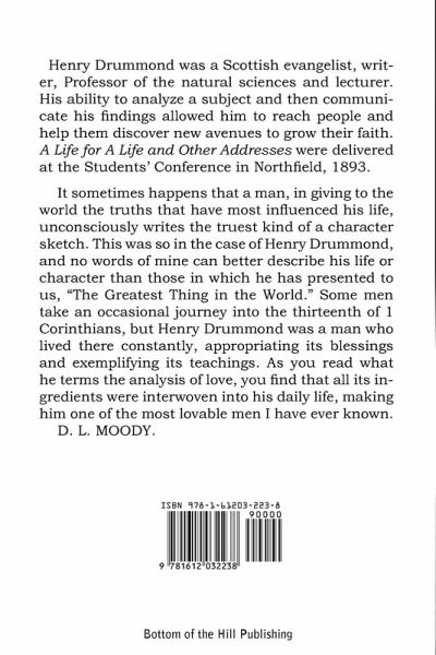 Henry Drummond was a Scottish evangelist, writer, Professor of the natural sciences and lecturer. His ability to analyze a subject and then communicate his findings allowed him to reach people and help them discover new avenues to grow their faith. A Life for A Life and Other Addresses were delivered at the Students' Conference in Northfield, 1893. It sometimes happens that a man, in giving to the world the truths that have most influenced his life, unconsciously writes the truest kind of a character sketch. This was so in the case of Henry Drummond, and no words of mine can better describe his life or character than those in which he has presented to us, "The Greatest Thing in the World." Some men take an occasional journey into the thirteenth of 1 Corinthians, but Henry Drummond was a man who lived there constantly, appropriating its blessings and exemplifying its teachings. As you read what he terms the analysis of love, you find that all its ingredients were interwoven into his daily life, making him one of the most lovable men I have ever known. D. L. MOODY.