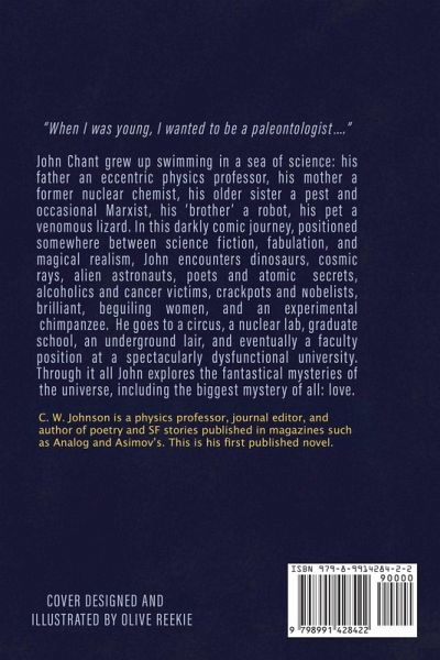 "...the best self-published novel I have read this year...clever, sad and funny by turns - and, occasionally, all at once"-- Big Al's Books and Pals "Heartbreaking and hilarious." Kirkus Reviews (starred review) 2025 BIBA winner fiction/non-genre 2024 Indies Today Best Literary Science Fiction "a masterful work of absurdist fiction that is remarkably grounded in authentic emotion and real science"-- Self Publishing Review The genre-crossing misadventures of a lonely boy genius. Vengeful dinosaurs. A runaway alien. Deadly subatomic particles. Parents who don't understand you. John Chant had an unusual childhood, sprinkled with a venomous pet lizard, a robot brother, an omelet competition, an island of monstrous secrets, and a malevolent chimpanzee. Exiled and on his own, he later negotiates graduate school, atomic secrets, and the challenges of death-rays. John is skilled at math and nuclear reactors, but he struggles with the universe's most difficult puzzle: love. "Thrillingly inventive novel of growing up the son of a mad scientist." BookLife review