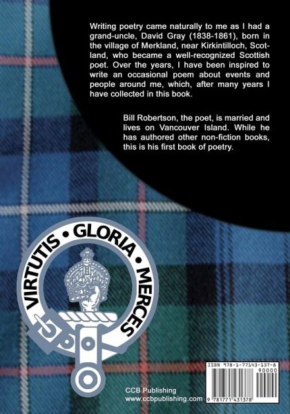 Writing poetry came naturally to Bill Robertson as he had a grand-uncle, David Gray (1838-1861), born in the village of Merkland, near Kirkintilloch, Scotland, who became a well-recognized Scottish poet. Over the years, Bill has been inspired to write an occasional poem about events and people around him, which, after many years have been collected in this book. About the Author: Bill Robertson, the poet, is married and lives on Vancouver Island. While he has authored other non-fiction books, this is his first book of poetry.