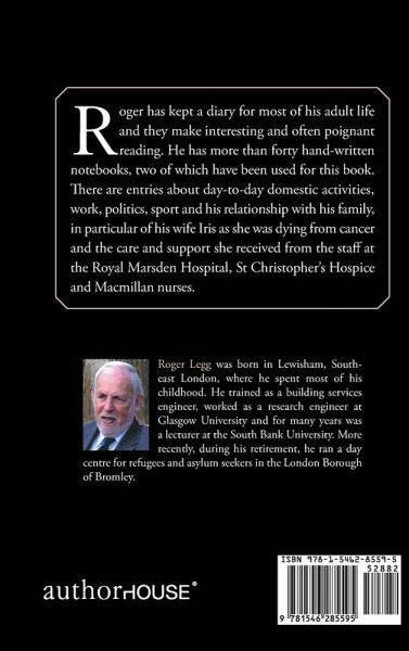Roger has kept a diary for most of his adult life and they make interesting and often poignant reading. He has more than forty hand-written notebooks, two of which have been used for this book. There are entries about day-to-day domestic activities, work, politics, sport and his relationship with his family, in particular of his wife Iris as she was dying from cancer and the care and support she received from the staff at the Royal Marsden Hospital, St Christophers Hospice and Macmillan nurses.