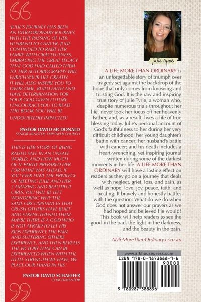 A Life More Than Ordinary is an unforgettable story of triumph over tragedy set against the backdrop of the hope that only comes from knowing and trusting God. It is the raw and inspiring true story of Julie Tyrie, a woman who, despite numerous trials throughout her life, never took her focus off her heavenly Father, and, as a result, lives a life of true blessing today. Julie's personal account of God's faithfulness to her during her very difficult childhood, her young daughter's battle with cancer, and her husband's battle with cancer and his death includes a heart-wrenching, yet inspiring, journal written during some of the darkest moments in her life. A Life More Than Ordinary will have a lasting effect on readers as they go on a journey that deals with neglect, grief, loss, and pain, as well as hope, love, joy, peace, faith, and healing. It bravely and honestly battles with the question: What do we do when God does not answer our prayers as we had hoped and believed He would? This book will help readers to see the good in the bad, the light in the darkness, and the beauty in the pain.