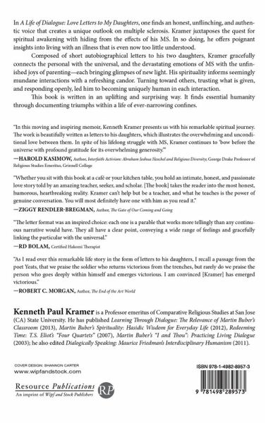 In A Life of Dialogue: Love Letters to My Daughters, one finds an honest, unflinching, and authentic voice that creates a unique outlook on multiple sclerosis. Kramer juxtaposes the quest for spiritual awakening with hiding from the effects of his MS. In so doing, he offers poignant insights into living with an illness that is even now too little understood. Composed of short autobiographical letters to his two daughters, Kramer gracefully connects the personal with the universal, and the devastating emotions of MS with the unfinished joys of parenting--each bringing glimpses of new light. His spirituality informs seemingly mundane interactions with a refreshing candor. Turning toward others, trusting what is given, and responding openly, led him to becoming uniquely human in each interaction. This book is written in an uplifting and surprising way. It finds essential humanity through documenting triumphs within a life of ever-narrowing confines.