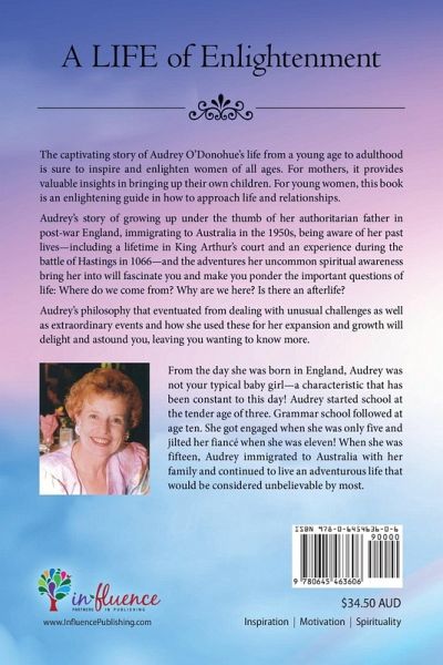 The captivating story of Audrey O'Donohue's life from a young age to adulthood is sure to inspire and enlighten women of all ages. For mothers it provides valuable insights in bringing up their own children. For young women, this book is an enlightening guide in how to approach life and relationships. Audrey's story of growing up under the thumb of her authoritarian father in post-war England, immigrating to Australia in the 1950s, being aware of her past lives - including a lifetime in King Arthur's Court and an experience during the battle of Hastings in 1066 - and the adventures her uncommon spiritual awareness bring her into will fascinate you and make you ponder the important questions of life; Where do we come from? Why are we here? Is there an afterlife? Audrey's philosophy that eventuated from dealing with unusual challenges as well as extraordinary events and how she used these for her expansion and growth will delight and astound you, leaving you wanting to know more.