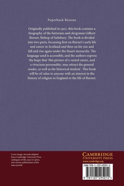 Originally published in 1907, this book contains a biography of the historian and clergyman Gilbert Burnet, Bishop of Salisbury. The book is divided into two parts, focussing first on Burnet's early life and career in Scotland and then on his rise and fall and rise again under the Stuart monarchs. The language used is accessible, and the authors express the hope that 'this picture of a varied career, and a vivacious personality, may attract the general reader, as well as the historical student'. This book will be of value to anyone with an interest in the history of religion in England or the life of Burnet.