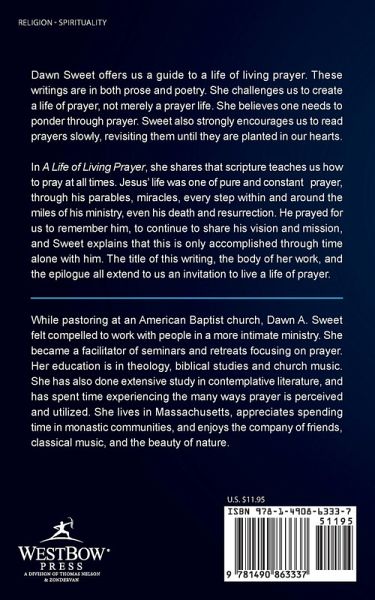 Dawn Sweet offers us a guide to a life of living prayer. These writings are in both prose and poetry. She challenges us to create a life of prayer, not merely a prayer life. She believes one needs to ponder through prayer. Sweet also strongly encourages us to read prayers slowly, revisiting them until they are planted in our hearts. In A Life of Living Prayer, she shares that scripture teaches us how to pray at all times. Jesus’ life was one of pure and constant prayer, through his parables, miracles, every step within and around the miles of his ministry, even his death and resurrection. He…mehr