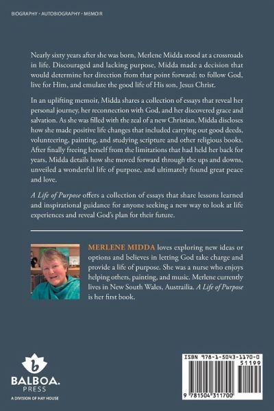 Nearly sixty years after she was born, Merlene Midda stood at a crossroads in life. Discouraged and lacking purpose, Midda made a decision that would determine her direction from that point forward: to follow God, live for Him, and emulate the good life of His son, Jesus Christ. In an uplifting memoir, Midda shares a collection of essays that reveal her personal journey, her reconnection with God, and her discovered grace and salvation. As she was filled with the zeal of a new Christian, Midda discloses how she made positive life changes that included carrying out good deeds, volunteering, painting, and studying scripture and other religious books. After finally freeing herself from the limitations that had held her back for years, Midda details how she moved forward through the ups and downs, unveiled a wonderful life of purpose, and ultimately found great peace and love. A Life of Purpose offers a collection of essays that share lessons learned and inspirational guidance for anyone seeking a new way to look at life experiences and reveal Gods plan for their future.