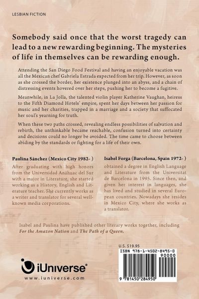 Somebody said once that the worst tragedy can lead to a new rewarding beginning. The mysteries of life in themselves can be rewarding enough. Attending the San Diego Food Festival and having an enjoyable vacation was all the Mexican chef Gabriela Estrada expected from her trip. However, as soon as she crossed the border, her existence plunged into an abyss, and a chain of distressing events hovered over her steps, pushing her to become a fugitive. Meanwhile, in La Jolla, the talented violin player Katherine Vaughan, heiress to the Fifth Diamond Hotels' empire, spent her days between her passion for music and her charities, trapped in a marriage and a society that suffocated her soul's yearning for truth. When these two paths crossed, revealing endless possibilities of salvation and rebirth, the unthinkable became reachable, confusion turned into certainty and decisions could no longer be avoided. The time came to choose between abiding by the standards or fighting for a life of their own. Paulina Sánchez (Mexico City 1982- ) After graduating with high honors from the Universidad Anáhuac del Sur with a major in Literature, she started working as a History, English and Literature teacher. She currently works as a writer and translator for several wellknown media corporations.
