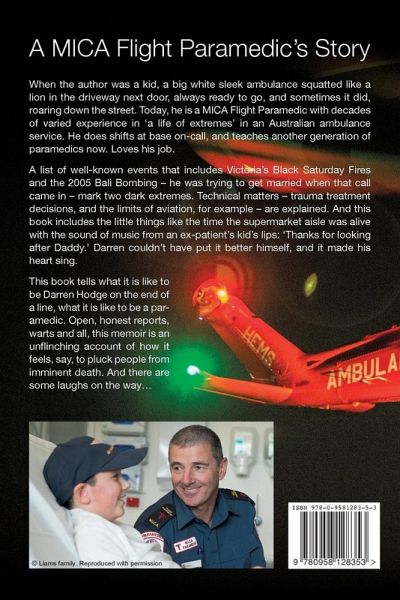When the author was a kid, a big white sleek ambulance squatted like a lion in the driveway next door, always ready to go, and sometimes it did, roaring down the street. Today he is a MICA Flight Paramedic with decades of varied experience in 'a life of extremes' in an Australian ambulance service. He does shifts at base on-call, and teaches another generation of paramedics now. Loves his job. A list of well-known events that includes Victoria's Black Saturday Fires and the 2005 Bali Bombing - he was trying to get married when that call came in - mark two dark extremes. Technical matters - trauma treatment decisions, and the limits of aviation, for example - are explained. And this book includes the little things like the time the supermarket aisle was alive with the sound of music from an ex-patient's kid's lips: 'Thanks for looking after Daddy.' Darren couldn't have put it better himself, and it made his heart sing. This book tells what is like to be Darren Hodge on the end of a line, what it is like to be a paramedic. Open, honest reports, warts and all, this memoir is an unflinching account of how it feels, say, to pluck people from imminent death. And there are some laughs on the way...