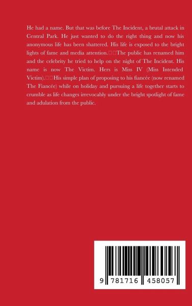 He had a name. But that was before The Incident, a brutal attack in Central Park. He just wanted to do the right thing and now his anonymous life has been shattered. His life is exposed to the bright lights of fame and media attention. The public has renamed him and the celebrity he tried to help on the night of The Incident. His name is now The Victim. Hers is Miss IV (Miss Intended Victim). His simple plan of proposing to his fiancée (now renamed The Fiancée) while on holiday and pursuing a life together starts to crumble as life changes irrevocably under the bright spotlight of fame and adulation from the public.