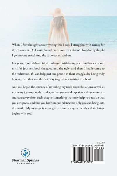 When I first thought about writing this book, I struggled with names for the characters. Do I write factual events or create them? How deeply should I go into my story? And the list went on and on. For years, I jotted down ideas and toyed with being open and honest about my life's journey, both the good and the ugly; and then I finally came to the realization, if I can help just one person in their struggles by being truly honest, then that was the best way to go about writing this book. And so I began the journey of unveiling my trials and tribulations as well as my many joys to you, the reader, so that you could experience those moments and take away from each chapter something that may help you realize that you are special and that you have unique talents that only you can bring into this world. My message is never give up and always remember that change begins with you!