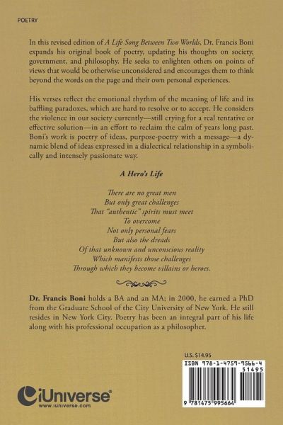 In this revised edition of A Life Song Between Two Worlds, Dr. Francis Boni expands his original book of poetry, updating his thoughts on society, government, and philosophy. He seeks to enlighten others on points of views that would be otherwise unconsidered and encourages them to think beyond the words on the page and their own personal experiences. His verses reflect the emotional rhythm of the meaning of life and its baffling paradoxes, which are hard to resolve or to accept. He considers the violence in our society currently-still crying for a real tentative or effective solution-in an effort to reclaim the calm of years long past. Boni's work is poetry of ideas, purpose-poetry with a message-a dynamic blend of ideas expressed in a dialectical relationship in a symbolically and intensely passionate way. A Hero's Life There are no great men But only great challenges That "authentic" spirits must meet To overcome Not only personal fears But also the dreads Of that unknown and unconscious reality Which manifests those challenges Through which they become villains or heroes.