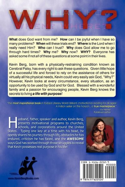 Imagine living life unable to walk, feed yourself, communicate clearly, or even dress yourself. How would you react? Would you blame God and be angry with Him? Could you ever consider thanking Him for such a condition? Kevin Berg, born Cerebral Palsy, has every right to ask God questions. Given little hope of a successful life and forced to rely on the assistance of others for virtually all his physical needs, Kevin could very easily ask God, "Why?" However, Kevin looks at every circumstance, every situation, as an opportunity to be used by God and for God. Blessed with a wonderful family and a passion for encouraging people, Kevin Berg knows the secrets to living a life with purpose! He openly shares his journey through life, obstacles he has endured, and the AWESOME ways God has worked through those struggles to reveal that Kevin possesses real purpose in his life!