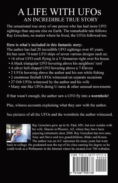 The exciting true story about one person who has had more UFO sightings than anyone else on Earth. The remarkable story follows Ray Groschen, no matter where he lived or with whom, the UFO's followed. Here's what makes this amazing true story so very special: 20 separate UFO sightings and 74 total UFO craft seen. The author has seen many different types of UFOs such as; A squadron of 16 ships flying in V formation right above authors house A black triangular UFO above neighbors' backyard A silver bell-shaped UFO above a 7-Eleven during the day Two saucer-shaped UFO's above the author and his son while fishing 27 Orb UFOs surrounded his home while he his wife and him were outside And the author witnessed a UFO fly into a wormhole. Pictures of the of all the UFO's and wormhole witnessed. Other witnesses tell their story of the UFO sightings.