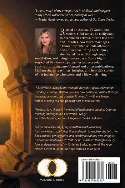 Raised on Australia's Gold Coast, Mellara Gold moved to Hollywood to become an actress. After a few film and TV roles, two failed marriages, a thankfully failed suicide attempt, and an incapacitating back injury, she healed herself through yoga, meditation, and living in awareness. Now a highly respected Bay Area yoga teacher and a regular contributor to Elephant Journal and other publications, Mellara shares teachings, insights, and heartfelt stories of her journey to wholeness and a life worth living. "A Life Worth Living is a book worth reading. Not only could I relate to many of the author's struggles, but also experienced a deep curiosity growing in me as I followed the stages of her transformational spiritual journey. Where would she take me next? This is not a book written with objectivity. It is the exact opposite. A Life Worth Living is written with a passion and fierceness that is the perfect antidote to any cool, above-it-all preaching about what happens when we commit ourselves to the path of yoga. I will gratefully carry the words of this Warrior-Princess-Seeker with me as I continue my own spiritual journey, feeling a little less lonely, a little less afraid, and a lot more inspired. Join us." - Judith Hanson Lasater, PhD, PT, has taught yoga around the world since 1971 and is the author of 11 books, most recently Teaching Yoga with Intention: The Essential Guide to Skillful Hands-on Assists and Verbal Communication. "Mellara's book dives deep into the passage of yoga and how we can use our practice (yoga), our breath, and our awareness to create more love and peace in our lives. I see so much of my own journey in Mellara's and suspect many others will relate to her journey as well." - Mariel Hemingway, actress and author of Out Came the Sun "A Life Worth Living is one woman's story of struggle, redemption, and deep learning. Mellara shows us how healing is possible through presence, devotion, and practical listening." - Elena Brower, author of Being You and podcast host of Practice You "As she shares her engaging and often heart-wrenching journey, Mellara's spirit rises time and again to reach for the light. Her book inspires, gently guides, and humbly reveals her own struggles and commitment to a path that she has mastered through honesty, love, and perseverance." - Christine Burke, author of The Yoga Healer, owner of Liberation Yoga Studio, Los Angeles "Mellara's love shines in her words of wisdom and practical Dharma teachings throughout A Life Worth Living. As she shares her journey with us, she sprinkles the path with supportive spiritual reminders that this life is precious and we can find inspiration and healing during even the most arduous moments. Keep this book by your side in these unsettling times!" - Núbia Teixeira, author of Yoga and the Art of Mudras, Founder of Bhakti Nova School of Yoga, Dance & Reiki, and of "Nubia's Devotional Yoga Online School" on Patreon "Reading this wonderful memoir and manual of yogic practice, Mellara brings us humbly and deftly into her experience, and in so doing into our own-and we come out the other end changed for the better. Mellara's love, light, and beauty can be felt in every word." - Melanie Salvatore-August, author of Fierce Kindness and Yoga to Support Immunity