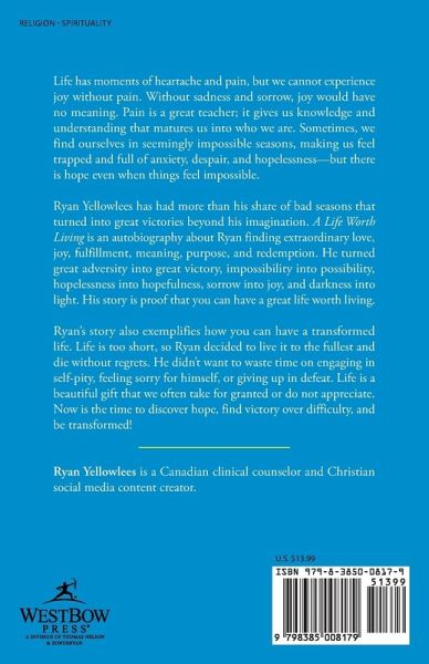 Life has moments of heartache and pain, but we cannot experience joy without pain. Without sadness and sorrow, joy would have no meaning. Pain is a great teacher; it gives us knowledge and understanding that matures us into who we are. Sometimes, we find ourselves in seemingly impossible seasons, making us feel trapped and full of anxiety, despair, and hopelessness-but there is hope even when things feel impossible. Ryan Yellowlees has had more than his share of bad seasons that turned into great victories beyond his imagination. A Life Worth Living is an autobiography about Ryan finding extraordinary love, joy, fulfillment, meaning, purpose, and redemption. He turned great adversity into great victory, impossibility into possibility, hopelessness into hopefulness, sorrow into joy, and darkness into light. His story is proof that you can have a great life worth living. Ryan's story also exemplifies how you can have a transformed life. Life is too short, so Ryan decided to live it to the fullest and die without regrets. He didn't want to waste time on engaging in self-pity, feeling sorry for himself, or giving up in defeat. Life is a beautiful gift that we often take for granted or do not appreciate. Now is the time to discover hope, find victory over difficulty, and be transformed!