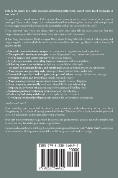 Unlock the secrets to a joyful marriage and lifelong partnership, even if you've faced challenges in love before! Are you ready to embark on one of life's most profound journeys, yet feel unsure about what to expect in marriage? Do you wish to deepen your understanding of love and strengthen the bond with your partner? Are you eager to explore the dynamics of a lasting relationship, but unsure where to start? If you answered "yes," you're not alone. Many in your shoes have felt the exact same way, but this comprehensive guide is here to transform those uncertainties into confidence. "A Life Long Commitment: What to Expect When You're Getting Married" is crafted with empathy and insight to guide you through the beautiful complexities of love and marriage. Here's a peek at what you'll discover inside:Essential communication techniques to express your feelings without sparking conflict The top conflict resolution strategies to turn disagreements into constructive conversations How to reignite and sustain intimacy with creative exercises Step-by-step methods for tackling financial discussions with ease and clarity Balancing your career ambitions with home responsibilities effortlessly The secret to aligning individual and couple goals, ensuring mutual growth and satisfaction Ways to agree on a parenting style that respects both partners' values and beliefs How to feel appreciated and recognize your partner's efforts through effective love languages Strategies to move past betrayal and rebuild trust and security Ways to manage external pressures from career, family, or social obligations Steps to open up emotionally and foster vulnerability in your relationship Empathy as a core element in enhancing understanding and building trust Sustaining passion over the long term, even amidst life's challenges Embracing inclusivity and diversity as strengths in your relationship Developing emotional intelligence with exercises for self-awareness and empathy ...and so much more! Understandably, you might feel skeptical if past experiences with relationship advice have been disappointing or if traditional therapy seemed ineffective. This book offers a fresh perspective grounded in real-life applications and modern relationship dynamics. Even with time constraints or a partner's disinterest, this guide provides concise, actionable insights that fit into your busy life and inspire mutual engagement. If you're ready to embrace a fulfilling, harmonious marriage, scroll up and click "Add to Cart" to start your journey towards a lifelong commitment filled with love, growth, and understanding!