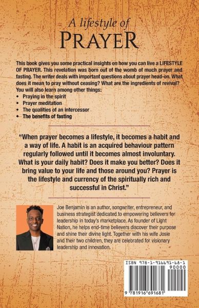 This book gives you some practical insights on how you can live a LIFESTYLE OF PRAYER. This revelation was born out of the womb of much prayer and fasting. The writer deals with important questions about prayer head-on. What does it mean to pray without ceasing? What are the ingredients of revival? You will also learn among other things: ¿ Praying in the spirit ¿ Prayer meditation ¿ The qualities of an intercessor ¿ The benefits of fasting "When prayer becomes a lifestyle, it becomes a habit and a way of life. A habit is an acquired behaviour pattern regularly followed until it becomes almost involuntary. What is your daily habit? Does it make you better? Does it bring value to your life and those around you? Prayer is the lifestyle and currency of the spiritually rich and successful in Christ." Joe Benjamin