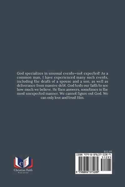 God specializes in unusual events--not expected! As a common man, I have experienced many such events, including the death of a spouse and a son, as well as deliverance from massive debt. God tests our faith to see how much we believe. He then answers, sometimes in the most unexpected manner. We cannot figure out God. We can only love and trust Him.