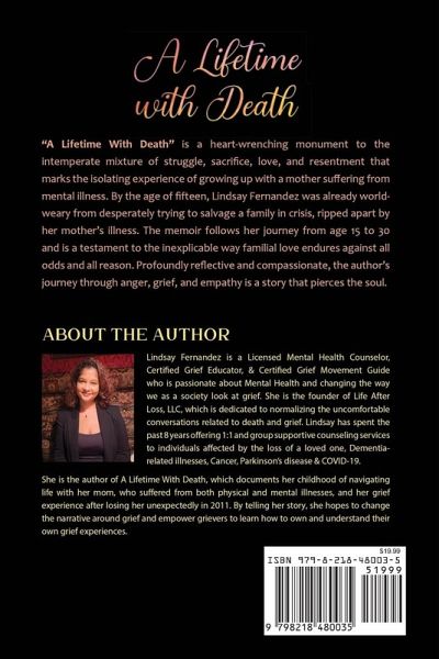 Lindsay Fernandez is a Licensed Mental Health Counselor, Certified Grief Educator, & Certified Grief Movement Guide passionate about Mental Health and changing how we as a society look at grief. She is the founder of Life After Loss, LLC, which is dedicated to normalizing uncomfortable conversations about death and grief. Lindsay has spent the past eight years offering 1:1 and group supportive counseling services to individuals affected by the loss of a loved one, Dementia-related illnesses, Cancer, Parkinson's disease & COVID-19. She is the author of A Lifetime With Death, which documents her childhood of navigating life with her mom, who suffered from both physical and mental illnesses, and her grief experience after losing her unexpectedly in 2011. By telling her story, she hopes to change the narrative around grief and empower grievers to learn how to own and understand their own grief experiences.