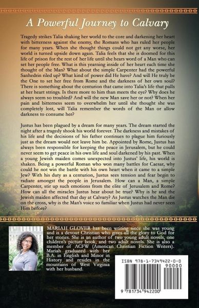 Tragedy strikes Talia shaking her world to the core and darkening her heart with bitterness against the enemy, the Romans who has ruled her people for many years. When she thought things could not get any worse, her world is turned upside down again. Talia feels that she is doomed for this life of prison for the rest of her life until she hears word of a Man who can set her people free. What is this yearning inside of her heart each time she thought of the Man? What about the simple Carpenter had the powerful Sanhedrin riled up? What kind of power did He have? And will He truly be the One to set her free from Rome and the darkness of her own soul? There is something about the centurion that came into Talia's life that pulls at her heart strings. Is there more to him than meets the eye? Why does he always seem so troubled? And will the new Man save her or not? When her pain and bitterness seem to overwhelm her until she thought she was completely lost, will Talia remember the words of the Man or allow darkness to consume her? Justus has been plagued by a dream for many years. The dream started the night after a tragedy shook his world forever. The darkness and mistakes of his life and the decisions of his father continues to plague him furiously just as the dream would not leave him be. Appointed by Rome, Justus has always been responsible for keeping the peace in Jerusalem, but he could never seem to get peace in his own life and soul darkened by his past. When a young Jewish maiden comes unexpected into Justus' life, his world is shaken. Being a powerful Roman who won many battles for Caesar, why could he not win the battle with his own heart when it came to a simple Jew maiden? With his duty as a centurion, Justus sees tension and fear begin to radiate amongst the people in Jerusalem. How can a Man, a simple Carpenter, stir up such emotions from the elite of Jerusalem and Rome? How can all the miracles Justus hear about be true? Why is he and the Jewish maiden affected that day at Calvary? As Justus watches the Man die on the cross, why is the Man's voice so familiar when Justus had never seen Him before?