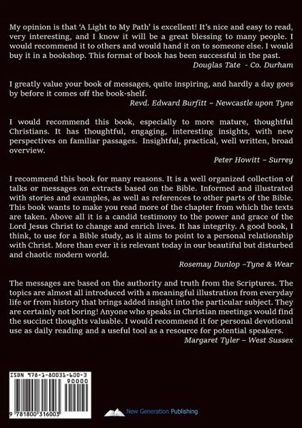 The book consists of over one hundred Scripture messages preached in local churches over a period of about thirty years. Each message has a theme title and covers two pages for easy daily reading. It is a candid testimony to the power and grace of the Lord Jesus Christ to change and enrich lives. It points to a personal relationship with Christ. Its title is intended to appeal to a wide audience of those looking for more meaning in life and points to a positive and wonderful future for all who put their faith and trust in Jesus Christ. "My opinion is that 'A Light to My Path' is excellent! It's nice and easy to read, very interesting, and I know it will be a great blessing to many people. I would recommend it to others and would hand it on to someone else. I would buy it in a bookshop. This format of book has been successful in the past." Douglas Tate - Co. Durham "I greatly value your book of messages, quite inspiring, and hardly a day goes by before it comes off the book-shelf." Revd. Edward Burfitt - Newcastle upon Tyne "I would recommend this book, especially to more mature, thoughtful Christians. It has thoughtful, engaging, interesting insights, with new perspectives on familiar passages. Insightful, practical, well written, broad overview." Peter Howitt - Surrey "I recommend this book for many reasons. It is a well organized collection of talks or messages on extracts based on the Bible. Informed and illustrated with stories and examples, as well as references to other parts of the Bible. This book wants to make you read more of the chapter from which the texts are taken. Above all it is a candid testimony to the power and grace of the Lord Jesus Christ to change and enrich lives. It has integrity. A good book, I think, to use for a Bible study, as it aims to point to a personal relationship with Christ. More than ever it is relevant today in our beautiful but disturbed and chaotic modern world." Rosemay Dunlop -Tyne & Wear "The messages are based on the authority and truth from the Scriptures. The topics are almost all introduced with a meaningful illustration from everyday life or from history that brings added insight into the particular subject. They are certainly not boring! Anyone who speaks in Christian meetings would find the succinct thoughts valuable. I would recommend it for personal devotional use as daily reading and a useful tool as a resource for potential speakers." Margaret Tyler - West Sussex