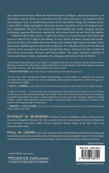 The essays in this volume, which are written by friends, colleagues, and former students, are dedicated to Gary B. McGee as a memorial to his life, work, and service. As a professor with a clear calling to teach, he modeled this passion at the Open Bible College (Des Moines, Iowa), Central Bible College (Springfield, Missouri), and the Assemblies of God Theological Seminary (Springfield, Missouri). He exuded the understanding that quality teaching, superior scholarship, a genuine Pentecostal spirituality, and an irenic spirit can and should go together. Within the title of this volume, A Light to the Nations, two aspects become clear. First, each person is called to be ""a light to the nations,"" as Gary McGee modeled. Second, and foundational to the first, is the reality that Jesus Christ is the ultimate light, and our energies, study, discussions, and life in general should rely on this fact. As a reflection of Gary McGee's life and ministry, these two aspects are focused through three lenses, which are the three sections of this volume: Ecumenism, Missions, and Pentecostalism. The essays represent a diversity of subjects and denote various explorations by colleagues and friends of Gary B. McGee. ""These deeply researched essays cast new light on old questions and raise new questions that the literature in these fields has overlooked. The volume offers a signal contribution to our understanding of the threads that have connected these fields in the past, today, and, without doubt, many years to come."" --Grant Wacker, Gilbert T. Rowe Professor of Christian History Emeritus, Duke Divinity School ""The late Gary McGee transformed scholarly understandings of Pentecostalism as a historical and missional movement. This strong collection of essays by outstanding scholars builds on his passions as well as his expertise. I recommend it very highly."" --Dana L. Robert, Truman Collins Professor of World Christianity and History of Mission, Boston University School of Theology ""A Light to the Nations . . . is an important book not only because it honors the memory of historian Gary B. McGee but also because it offers penetrating insights into Catholic-Pentecostal ecumenism, missions history and theology, and global Pentecostalism that propel a critical examination of current missiology. Perceptive chapters by leading Catholic, conciliar, and independent scholars produce a fascinating guide to the contemporary Christian world coupled with intriguing nudges into the future."" --Robert L. Gallagher, Chair, Director of MA (Intercultural Studies), and Associate Professor of Intercultural Studies, Wheaton College Graduate School ""The chapters in this volume constitute a fitting tribute to Gary McGee, one of the most appreciated and influential scholars of modern church history. The authors are leaders in their specialties in the study of ecumenism, missions, or Pentecostalism (or all three). These deeply researched essays cast new light on old questions and raise new questions that the literature in these fields has overlooked. The volume offers a signal contribution to our understanding of the threads that have connected these fields in the past, today, and, without doubt, many years to come."" --Grant Wacker, Gilbert T. Rowe Professor of Christian History Emeritus, Duke Divinity School; author of America's Pastor: Billy Graham and the Shaping of a Nation (Harvard 2014) ""The late Gary McGee transformed scholarly understandings of Pentecostalism as a historical and missional movement. This strong collection of essays by outstanding scholars builds on his passions as well as his expertise. I recommend it very highly."" --Dana L. Robert, Truman Collins Professor of World Christianity and History of Mission, Boston University School of Theology ""A Light to the Nations, edited by Stanley M. Burgess and Paul W. Lewis, is an important book not only because it honors the memory of historian Gary B. McGee, but also because it offers p