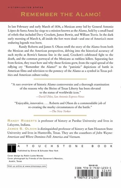 In late February and early March of 1836, a Mexican army led by General Antonio López de Santa Anna lay siege to a mission known as the Alamo, held by a small band of rebels that included Davy Crockett, James Bowie, and William Travis. In the dark early morning of March 6, all inside the fort were dead -- and one of America's most enduring legends was born. Randy Roberts and James S. Olson retell the story of the Alamo from both the Mexican and the American perspectives, delving into the historical accuracy of such myths as Bowie's famous line in the sand, Crockett's celebrated fight to the death, and the common portrayal of the Mexicans as ruthless killers. Separating fact from fiction, they trace how and why those fictions grew, from the rapid spread of the rallying cry "Remember the Alamo!" to the "patriotic" depictions of battle in American films and television to the potency of the Alamo as a symbol in Texas politics and American culture today.