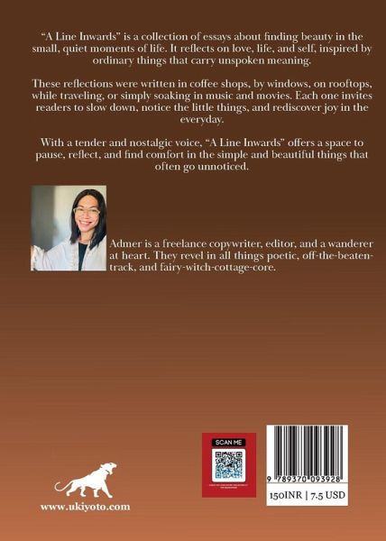 "A Line Inwards" is a collection of essays about finding beauty in the small, quiet moments of life. It reflects on love, life, and self, inspired by ordinary things that carry unspoken meaning. These reflections were written in coffee shops, by windows, on rooftops, while traveling, or simply soaking in music and movies. Each one invites readers to slow down, notice the little things, and rediscover joy in the everyday. With a tender and nostalgic voice, "A Line Inwards" offers a space to pause, reflect, and find comfort in the simple and beautiful things that often go unnoticed.