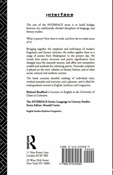This introductory book takes the reader through literary history from the Renaissance to Postmodernism, and considers individual texts as paradigms which can both reflect and unsettle their broader linguistic and cultural contexts. Richard Bradford provides detailed readings of individual texts which emphasize their relation to literary history and broader socio-cultural contexts, and which take into account developments in structuralism and postmodernism. Texts include poems by Donne, Herbert, Marvell, Milton, Pope, Wordsworth, Coleridge, Blake, Keats, Hopkins, Browning, Pound, Eliot, Carlos Williams, Auden, Larkin and Geoffrey Hill.
