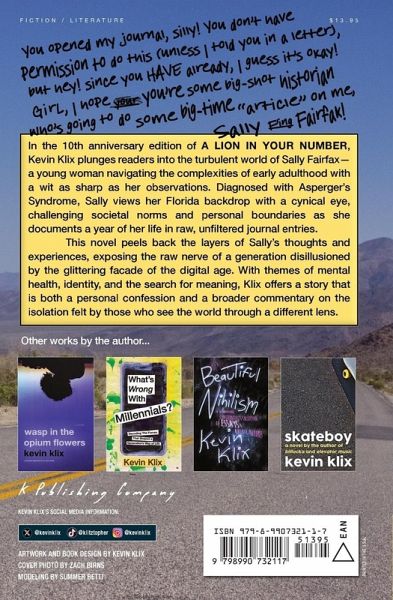 In the 10th anniversary edition of A LION IN YOUR NUMBER, Kevin Klix plunges readers into the turbulent world of Sally Fairfax-a young woman navigating the complexities of early adulthood with a wit as sharp as her observations. Diagnosed with Asperger's Syndrome, Sally views her Florida backdrop with a cynical eye, challenging societal norms and personal boundaries as she documents a year of her life in raw, unfiltered journal entries. This novel peels back the layers of Sally's thoughts and experiences, exposing the raw nerve of a generation disillusioned by the glittering facade of the digital age. With themes of mental health, identity, and the search for meaning, Klix offers a story that is both a personal confession and a broader commentary on the isolation felt by those who see the world through a different lens.