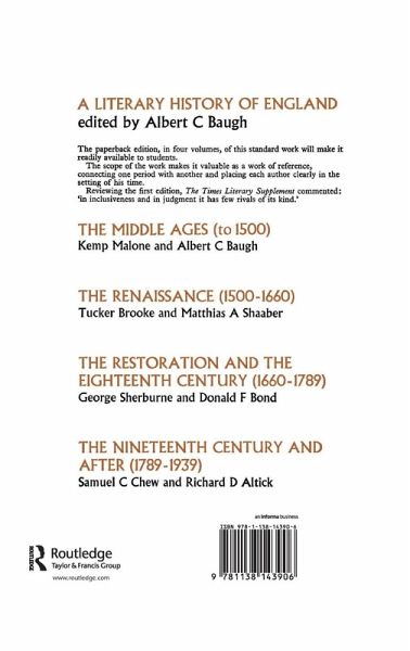 The paperback edition, in four volumes, of this standard work will make it readily available to students. The scope of the work makes it valuable as a work of reference, connecting one period with another and placing each author clearly in the setting of his time. Reviewing the first edition, The Times Literary Supplement commented: 'in inclusiveness and in judgment it has few rivals of its kind'. This first volume covers The Middle Ages (to 1500) in two sections: The Old English Period (to 1100) by Kemp Malone (John Hopkins University), and The Middle English Period (1100-1500) by Albert C. Baugh (University of Pennsylvania).…mehr
