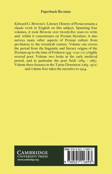 Nearly a hundred years since its publication, E. G. Browne's A Literary History of Persia remains a classic work in English on the subject. Spanning four volumes, it took Browne over 25 years to write and whilst it concentrates on Persian literature, it surveys many aspects of Persian culture from pre-history to the twentieth century. Volume one covers the period from the earliest periods of Persian history until Firdawsi (AD 935-1020) a highly revered poet. Volume two looks at the early medieval period and in particular on the poet Saadi (1184-1283). Volume three focuses on the Tartar Dominion (1265-1502) and volume four 'Modern Times' covers from 1500 to 1924. A remarkable achievement upon first publication, Cambridge University Press is pleased to be able to bring its edition of this seminal work back into print.