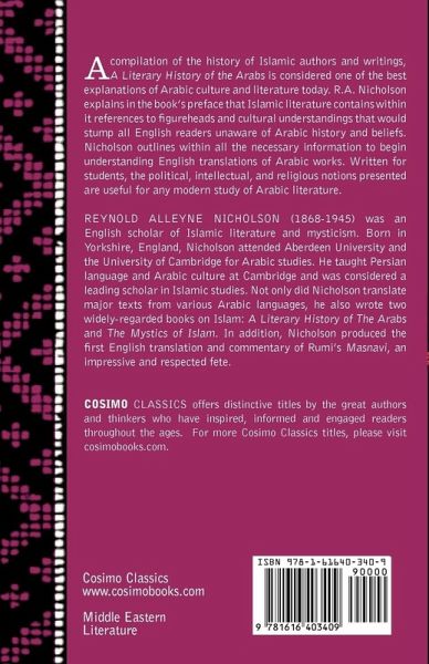 A compilation of the history of Islamic authors and writings, A Literary History of the Arabs is considered one of the best explanations of Arabic culture and literature today. R.A. Nicholson explains in the book's preface that Islamic literature contains within it references to figureheads and cultural understandings that would stump all English readers unaware of Arabic history and beliefs. Nicholson outlines within all the necessary information to begin understanding English translations of Arabic works. Written for students, the political, intellectual, and religious notions presented are useful for any modern study of Arabic literature. REYNOLD ALLEYNE NICHOLSON (1868-1945) was an English scholar of Islamic literature and mysticism. Born in Yorkshire, England, Nicholson attended Aberdeen University and the University of Cambridge for Arabic studies. He taught Persian language and Arabic culture at Cambridge and was considered a leading scholar in Islamic studies. Not only did Nicholson translate major texts from various Arabic languages, he also wrote two widely-regarded books on Islam: A Literary History of The Arabs and The Mystics of Islam. In addition, Nicholson produced the first English translation and commentary of Rumi's Masnavi, an impressive and respected fete.