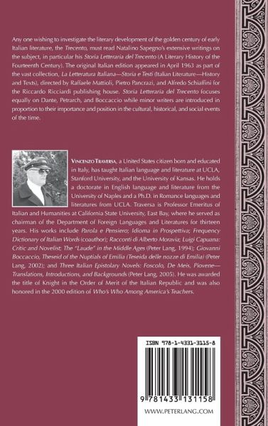 Vincenzo Traversa, a United States citizen born and educated in Italy, has taught Italian language and literature at UCLA, Stanford University, and the University of Kansas. He holds a doctorate in English language and literature from the University of Naples and a PhD in Romance languages and literatures from UCLA. Traversa is Professor Emeritus of Italian and Humanities at California State University, East Bay, where he served as chairman of the Department of Foreign Languages and Literatures for thirteen years. His works include Parola e Pensiero; Idioma in Prospettiva; Frequency Dictionary of Italian Words (coauthor); Racconti di Alberto Moravia; Luigi Capuana: Critic and Novelist; The «Laude» in the Middle Ages (Peter Lang, 1994); Giovanni Boccaccio, Theseid of the Nuptials of Emilia (Teseida delle nozze di Emilia) (Peter Lang, 2002); and Three Italian Epistolary Novels: Foscolo, De Meis, Piovene ¿ Translations, Introductions, and Backgrounds (Peter Lang, 2005). He was awarded the title of Knight in the Order of Merit of the Italian Republic and was also honored in the 2000 edition of Who¿s Who Among Americäs Teachers.