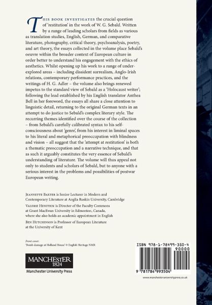 This book investigates the crucial question of 'restitution' in the work of W. G. Sebald. Written by leading scholars from a range of disciplines, with a foreword by his English translator Anthea Bell, the essays collected in this volume place Sebald's oeuvre within the broader context of European culture in order to better understand his engagement with the ethics of aesthetics. Whilst opening up his work to a range of under-explored areas including dissident surrealism, Anglo-Irish relations, contemporary performance practices and the writings of H. G. Adler, the volume notably returns to the original German texts. The recurring themes identified in the essays - from Sebald's carefully calibrated syntax to his self-consciousness about 'genre', from his interest in liminal spaces to his literal and metaphorical preoccupation with blindness and vision - all suggest that the 'attempt at restitution' constitutes the very essence of Sebald's understanding of literature.