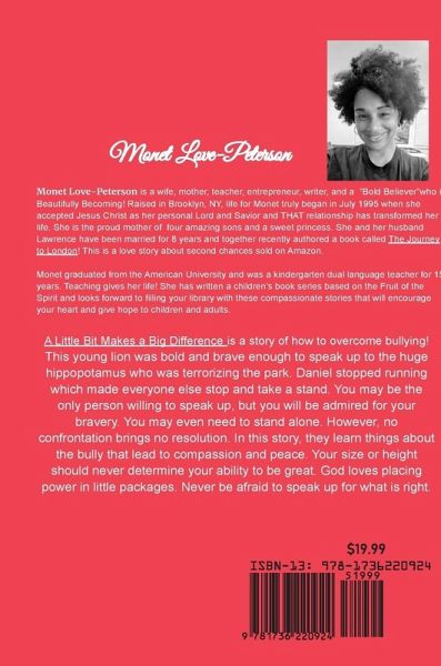 A Little Bit Makes a Big Difference is a story of how to overcome bullying! This young lion was bold and brave enough to speak up to the huge hippopotamus who was terrorizing the park. Daniel stopped running which made everyone else stop and take a stand. You may be the only person willing to speak up, but you will be admired for your bravery. You may even need to stand alone. However, no confrontation brings no resolution. In this story, they learn things about the bully that lead to compassion and peace.