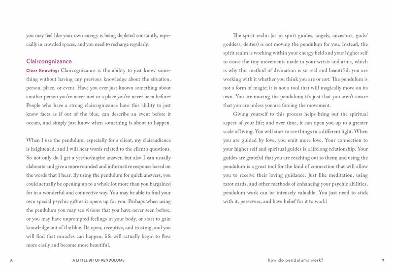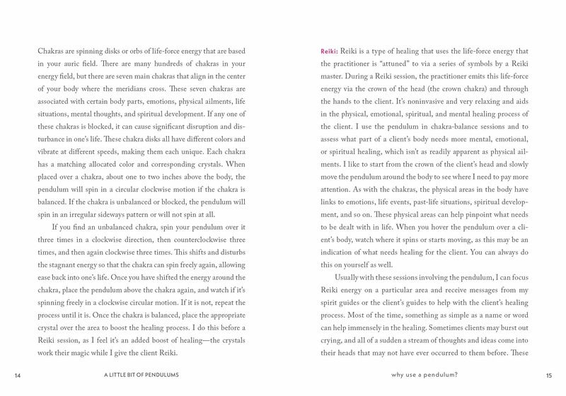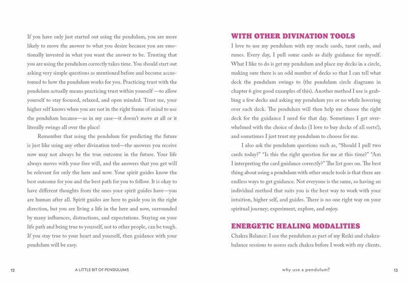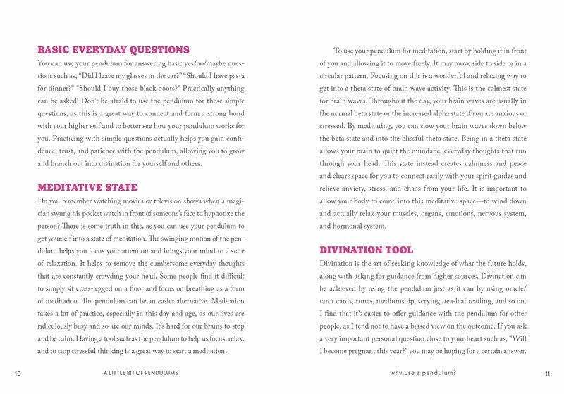 In the popular “Little Bit of” series: a fresh, accessible introduction to the practice of using pendulums. With every swing of the pendulum, you can develop your spiritual energy. Dani Bryant, a green witch, provides an easy-to-follow guide that explains how to choose or craft your pendulum, and use it for dowsing and divination. You’ll find rituals for clearing negativity, balancing chakras, making contact with the spirit world, meditation, generating accurate answers to your questions, and much more.
