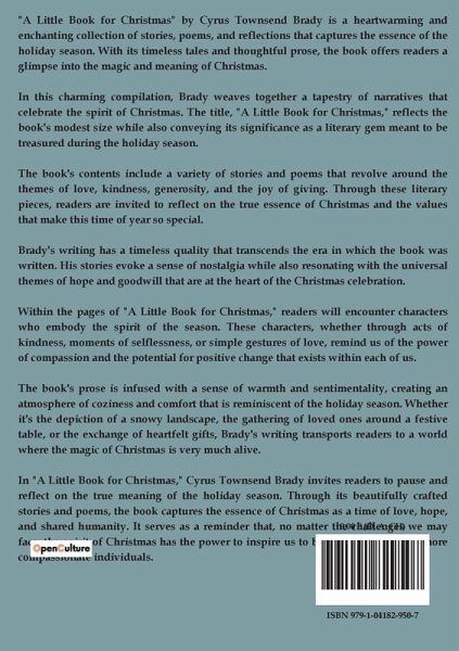 "A Little Book for Christmas" by Cyrus Townsend Brady is a collection of stories, reflections, and meditations centered around the theme of Christmas. The book opens with a preface where Brady, a priest and author, shares his deep connection to Christmas, both as a religious observance and a universal celebration of goodwill. He reflects on the joy and sorrow intertwined with the holiday, emphasizing the importance of giving and the spirit of goodwill toward all. The book includes various stories, each exploring different aspects of Christmas. One pivotal story, "From a Far Country," is a modern retelling of the prodigal son parable. It follows a wayward son who returns home too late to reconcile with his deceased father, only to find forgiveness and a chance for redemption through his brother. This narrative highlights themes of forgiveness, family, and the transformative power of love. Another section, "On Christmas Giving," offers advice on the true spirit of giving during the holiday season. Brady cautions against extravagance and encourages thoughtful, heartfelt gifts that reflect the giver's affection and consideration. He stresses the importance of giving without expecting anything in return and suggests that the best gifts are those that bring joy and happiness to others. The book also includes a story for children, "It Was the Same Christmas Morning," which contrasts the experiences of two little girls from different socioeconomic backgrounds on Christmas morning. This tale underscores the disparities in wealth and the universal nature of Christmas joy, regardless of material circumstances. Throughout the book, Brady weaves together personal anecdotes, fictional stories, and reflections to capture the essence of Christmas as a time of joy, reflection, and goodwill. His writing invites readers to embrace the holiday's deeper meanings and to carry its spirit of love and generosity beyond the season.