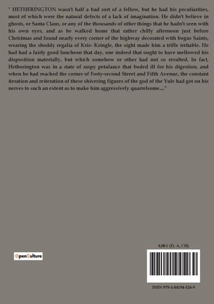 " HETHERINGTON wasn't half a bad sort of a fellow, but he had his peculiarities, most of which were the natural defects of a lack of imagination. He didn't believe in ghosts, or Santa Claus, or any of the thousands of other things that he hadn't seen with his own eyes, and as he walked home that rather chilly afternoon just before Christmas and found nearly every corner of the highway decorated with bogus Saints, wearing the shoddy regalia of Kris- Kringle, the sight made him a trifle irritable. He had had a fairly good luncheon that day, one indeed that ought to have mellowed his disposition materially, but which somehow or other had not so resulted. In fact, Hetherington was in a state of raspy petulance that boded ill for his digestion, and when he had reached the corner of Forty-second Street and Fifth Avenue, the constant iteration and reiteration of these shivering figures of the god of the Yule had got on his nerves to such an extent as to make him aggressively quarrelsome...."