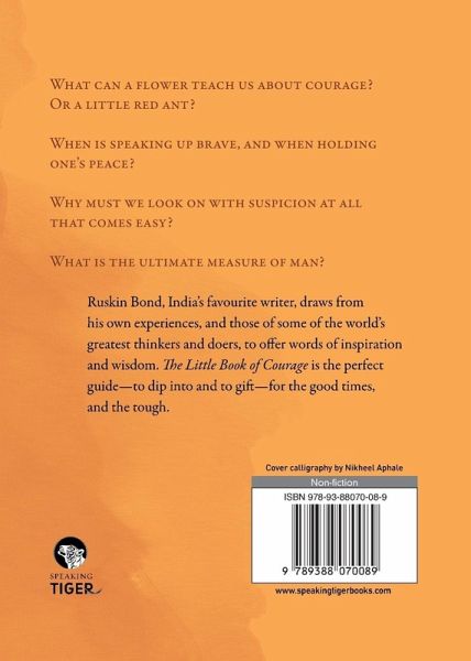 Part of the bestselling 'Little Book' series, a new title by India's favourite author Ruskin Bond What can a flower teach us about courage? Or a little red ant? When is speaking up brave, and when holding one's peace? Why must we look on with suspicion at all that comes easy? What is the ultimate measure of man? Ruskin Bond, India's favourite writer, draws from his own experiences, and those of some of the world's greatest thinkers and doers, to offer words of inspiration and wisdom. A Little Book of Courage is the perfect guide-to dip into and to gift-for the good times, and the tough.