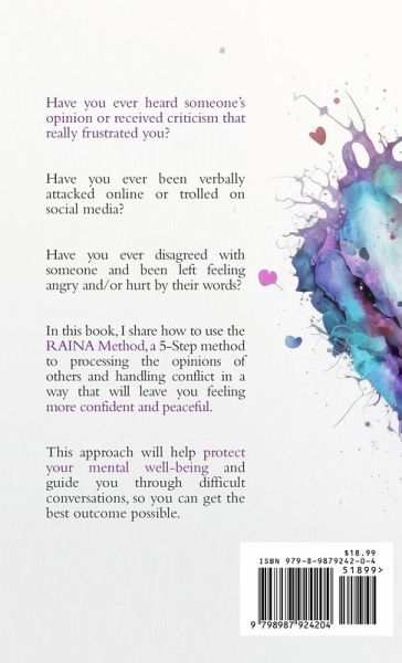 Have you ever heard someone's opinion or received criticism that really frustrated you? Have you ever been verbally attacked online or trolled on social media? Have you ever disagreed with someone and been left feeling angry and/or hurt by their words? In this book, I share how to use the RAINA Method, a 5-Step method to processing the opinions of others and handling conflict in a way that will leave you feeling more confident and peaceful. This approach will help protect your mental well-being and guide you through difficult conversations, so you can get the best outcome possible.