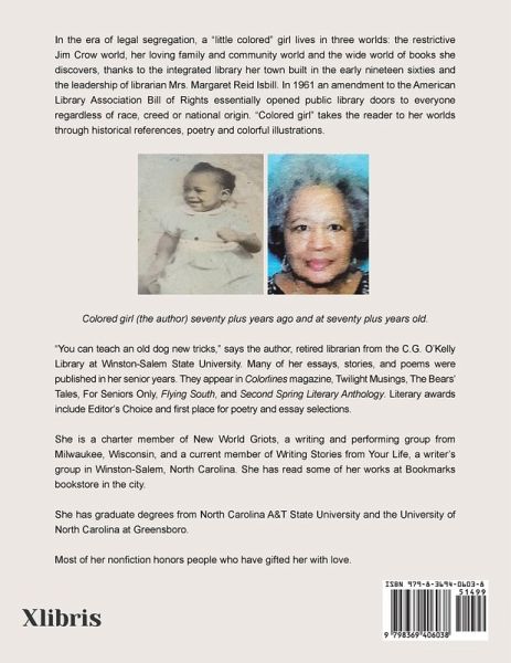 In the era of legal segregation, a "little colored" girl lives in three worlds: the restrictive Jim Crow world, her loving family and community world and the wide world of books she discovers, thanks to the integrated library her town built in the early nineteen sixties and the leadership of librarian Mrs. Margaret Reid Isbill. In 1961 an amendment to the American Library Association Bill of Rights essentially opened public library doors to everyone regardless of race, creed or national origin. "Colored girl" takes the reader to her worlds through historical references, poetry and colorful illustrations.