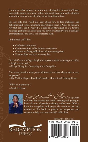 If you are a coffee drinker-or know one-this book is for you! You'll learn some little-known facts about coffee, and you'll hear from coffee drinkers around the country as to why they drink the delicious brew. But not only that, you'll also learn about how to face challenges and difficulties and come out smiling and walking closer to God. In the same way that coff ee can be viewed as a dark and bitter liquid or as a favorite beverage, problems can either drag you down or catapult you to a feeling of accomplishment and joy as you overcome them. In this book you'll find: Coff ee facts and trivia Comments from coff ee drinkers everywhere Counsel on facing diffi culties and overcoming them Favorite Bible verses to use every day "A Little Cream and Sugar delights both palettes,while enjoying your coffee, it delights your spirit." --Evelyn Turnquist, Convening of the Evangelists "I've known Jean for many years and found her to have a heart and concern for people." --Dr. M.Tina Dupree, President/Founder, Motivational Training Center "What an inspiration..." --Sarah A. Person Jean "Notewell" Williams is a pastor's wife who has traveled the world, meeting and getting to know all sorts of people, including coffee lovers. With a heart for evangelism and prayer, she combines wit and wisdom in this book to provide encouragement and strength to help you overcome life's difficulties.