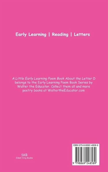 A Little Early Learning Poem Book About the Letter D belongs to the Early Learning Poem Book Series by Walter the Educator. Collect them all and more poetry books at WaltertheEducator.com. This book is dedicated to the parents of early learners.