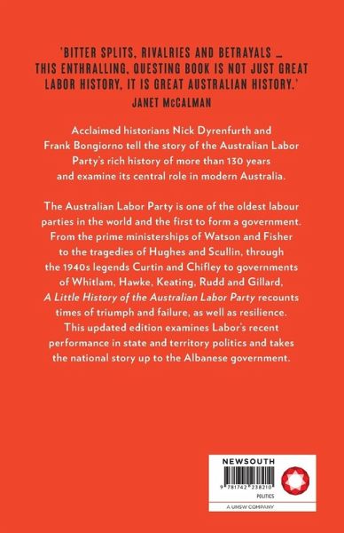 Acclaimed historians Nick Dyrenfurth and Frank Bongiorno tell the story of the Australian Labor Party's rich history of more than 130 years and examine its central role in modern Australia. The Australian Labor Party is one of the oldest labour parties in the world and the first to form a government. From the prime ministerships of Watson and Fisher to the tragedies of Hughes and Scullin, through the 1940s legends Curtin and Chifley to governments of Whitlam, Hawke, Keating, Rudd and Gillard, A Little History of the Australian Labor Party recounts times of triumph and failure, as well as resilience. This updated edition examines Labor's recent performance in state and territory politics and takes the national story up to the Albanese government. 'Informative and insightful, the authors shrewdly marshal the key events, policies and personalities in Labor's long and lively history to tell the compelling story of the party that has shaped Australia more than any other. I enjoyed it immensely.' - Troy Bramston 'The history of Australia's Labor Party is the story of how ordinary men and women dreamed, organised, argued and raged to form a political movement that has weathered wars, depressions, financial crises, bitter splits, rivalries and betrayals, and yet forged great alliances to shape this country into a good and safe place to live. The story of Labor is the story of a nation that was not born on a distant battlefield, but in the homes and workplaces, pubs and halls where people gathered to make the world better. This enthralling, questing book is not just great Labor history, it is great Australian history.' - Janet McCalman