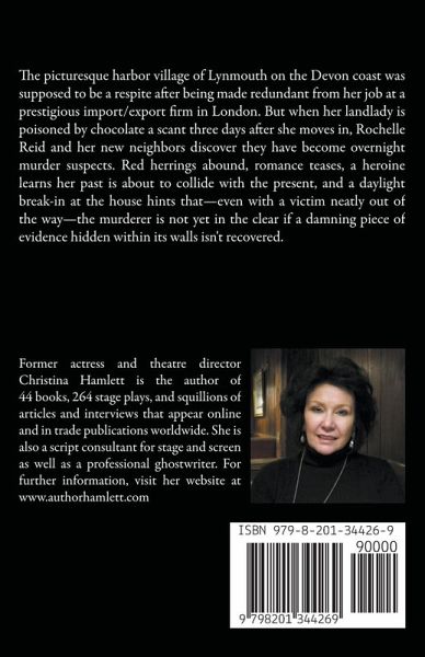 The picturesque harbor village of Lynmouth on the Devon coast was supposed to be a respite after being made redundant from her job at a prestigious import/export firm in London. But when her landlady is poisoned by chocolate a scant three days after she moves in, Rochelle Reid and her new neighbors discover they have become overnight murder suspects. Red herrings abound, romance teases, a heroine learns her past is about to collide with the present, and a daylight break-in at the house hints that—even with a victim neatly out of the way—the murderer is not yet in the clear if a damning piece of evidence hidden within its walls isn't recovered.