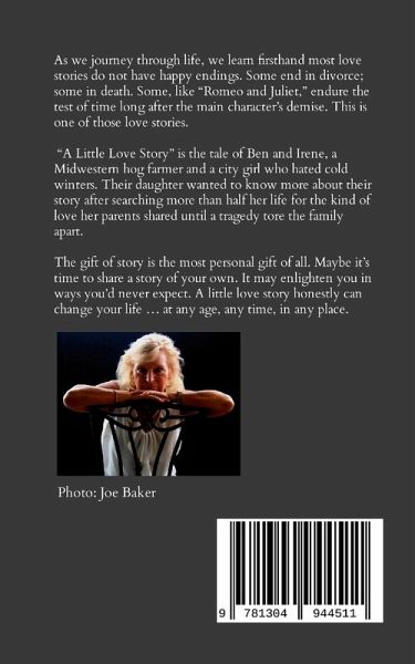 As we journey through life, we learn firsthand most love stories do not have happy endings. Some end in divorce; some in death. Some, like "Romeo and Juliet," endure the test of time long after the main character's demise. This is one of those love stories. "A Little Love Story" is the tale of Ben and Irene, a Midwestern hog farmer and a city girl who hated cold winters. Their daughter wanted to know more about their story after searching more than half her life for the kind of love her parents shared until a tragedy tore the family apart. The gift of story is the most personal gift of all. Maybe it's time to share a story of your own. It may enlighten you in ways you'd never expect. A little love story honestly can change your life ... at any age, any time, in any place.
