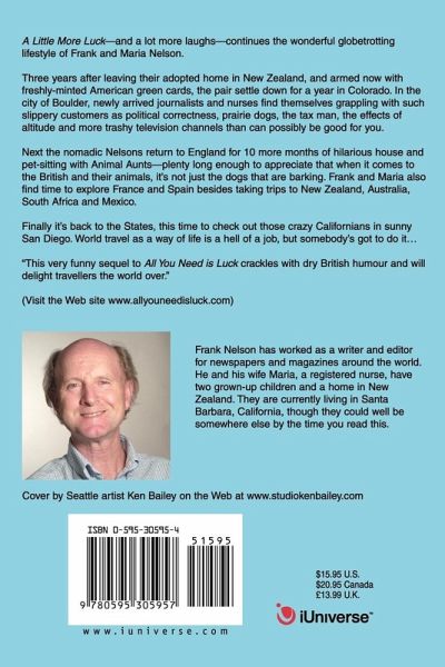 A Little More Luck--and a lot more laughs--continues the wonderful globetrotting lifestyle of Frank and Maria Nelson. Three years after leaving their adopted home in New Zealand, and armed now with freshly-minted American green cards, the pair settle down for a year in Colorado. In the city of Boulder, the newly arrived journalists and nurses find themselves grappling with such slippery customers as political correctness, prairie dogs, the tax man, the effects of altitude and more trashy television channels than can possibly be good for you. Next the nomadic Nelsons return to England for 10 more months of hilarious house and pet-sitting with Animal Aunts--plenty long enough to appreciate that when it comes to the British and their animals, it's not just the dogs that are barking. Frank and Maria also find time to explore France and Spain besides taking trips to New Zealand, Australia, South Africa and Mexico. Finally it's back to the States, this time to check out those crazy Californians in sunny San Diego. World travel as a way of life is a hell of a job, but somebody's got to do it... "This very funny sequel to All You Need is Luck crackles with dry British humour and will delight travellers the world over." (Visit the Web site www.allyouneedisluck.com)